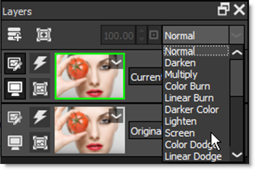 1 On the Current layer where no filter has been applied, select a Layer Blend Mode.