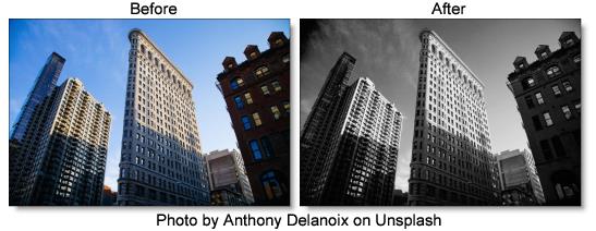 Black and White converts color images to black and white simulating the look of Black and White photographic filters.