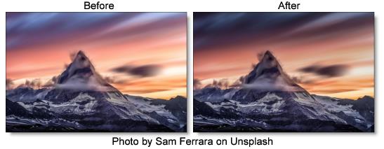 ND (Neutral Density) Gradient darkens only a portion of the image using a graduated transition between the darkened portion and the original image. It selectively adjusts brightness without affecting color balance. The most likely use for ND Gradient would be to balance the difference between the sky and ground in a landscape.