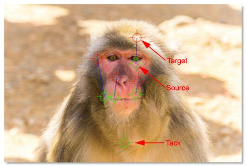 A total of 20 pins can be added to an image. Pins have a source (green circle) and target (red circle). The farther the target is dragged from the source, the more the image warps.