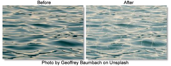Simulates the patterns created when light rays are reflected or refracted by a curved surface. Caustics can often be seen at the bottom of a swimming pool in bright sunlight or on objects viewed underwater.
