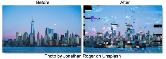 Simulates bad digital TV transmission with many options, including freeze-frames, shifting and flowing blocks, various kinds of blocky noise, and pixelization. Can give looks similar to MPEG stream errors, digital dropouts, and satellite feed data corruption.