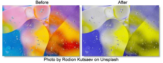 Generates a dual color-channel version of the image, as might be perceived by the limited color vision system of dogs. Humans have three color receptors (for red, green, and blue) while dogs have only two receptors (for yellow and blue).