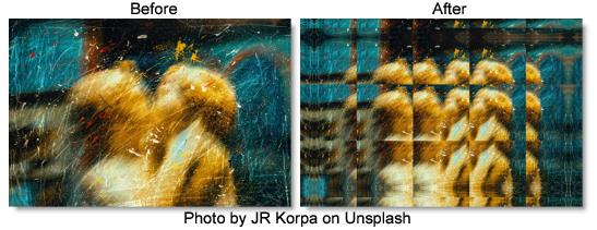 Breaks the image into rectangular shaped tiles and transforms the image within each shape to create a fly's eye view effect.