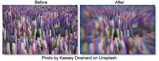 Separates the image into spectral bands and warps them by different amounts. The red is warped by the From transformation, the blue by the To transformation, with the other colors of the spectrum in between.