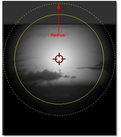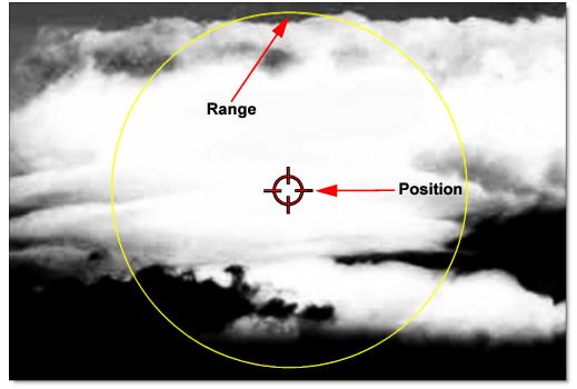 In addition to using the slider controls in the Toolbar, the Position, Range and Radius parameters can be set using on-screen controls. Click on the image to place the on-screen control which consists of a center point and a solid circle. The Position value is set by the location of the center point, while the Range is set by sizing the circle. The larger the circle, the larger the range.