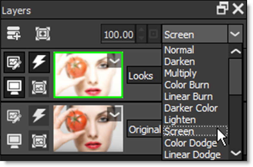 In addition to opacity, Layers can be combined with the layer below using a variety of Blend modes.