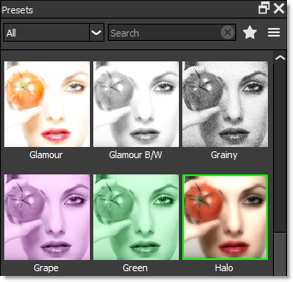 2 In the Presets window, choose a new preset group from the pop-up menu to see a different set of filter presets.