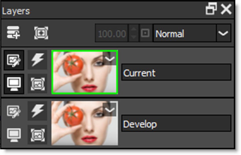 You are now viewing and editing the Develop layer. The layer that you are editing is considered the active layer. You can tell which layer is active by the green outline around its image thumbnail in the Layers window.