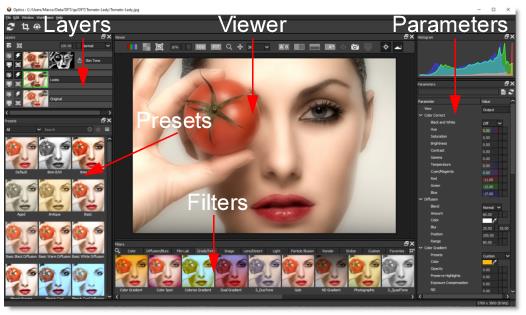 Optics is comprised of 5 main components: Viewer, Filters, Presets, Parameters, and Layers.
