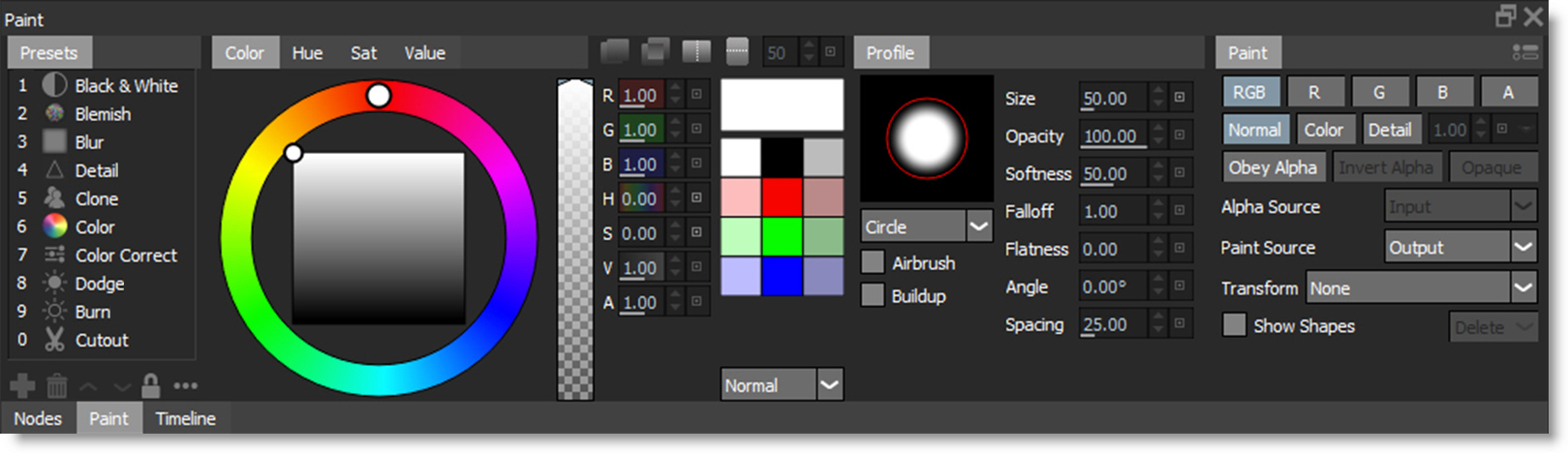 Black & White, Blemish, Blur, Burn, Clone, Color, Color Correct, Cutout, Detail, Dodge, Drag, Eraser, Grain, Mosaic, Repair and Scatter brushes are available for any task. As you paint, every action you make is recorded as events. These events can be selectively played back on the same frame, different frames, multiple frames and with or without tracking data applied. This makes for a very powerful and versatile Auto Paint feature that provides the flexibility of vector paint with the speed of a raster paint system.