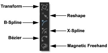 Since open shapes are required for Lens Correction, it has its own shape tools similar to those in the Roto node. You can choose from B-Spline, Bézier, X-Spline or Magnetic Freehand shapes and have use of the Transform and Reshape tools as well.