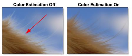 If you look closely at the edges of our dog example, you will see some white fringing created by the sky from the original image. By activating Power Matte’s Color Estimation feature, the fringing can be removed by estimating the color of the foreground in unknown and semi-transparent areas.