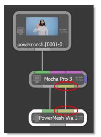 3 Connect the Mocha Pro Data output into the PowerMesh Warp node’s Data input located at the top right of the node.