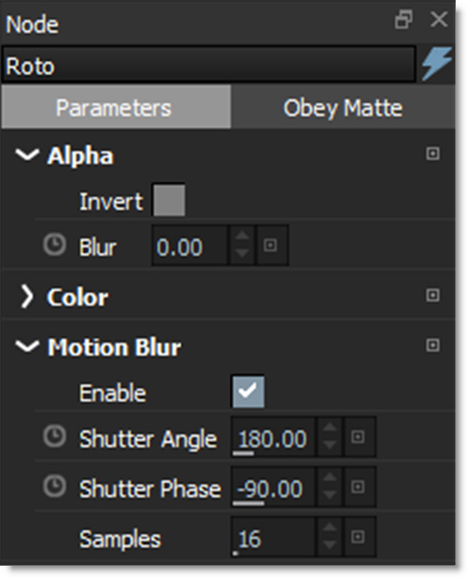 2 In the Node parameters, enable Motion Blur and adjust the Shutter Angle, Shutter Phase and Samples as desired.