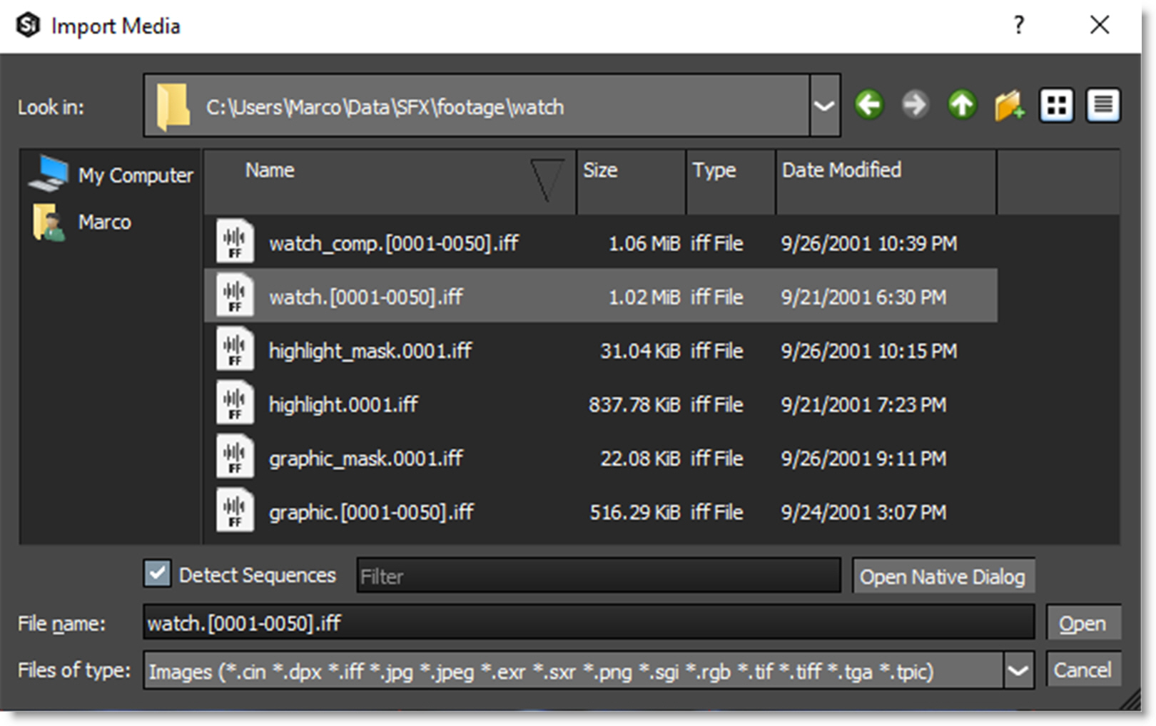 Opens the OS’s native file browser. Whether Silhouette’s custom file browser or the OS’s native file browser is used by default is set using the User Interface > Use Native File Dialog For Importing Media preference.