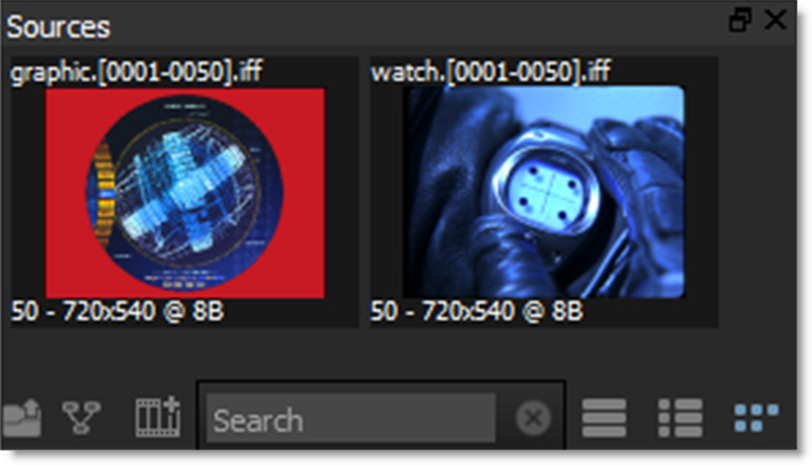 Clips and sequences can be searched for by entering text in the Search field. Once text is entered, only matching items are shown. Clear the search text to return the Sources window to its normal state.