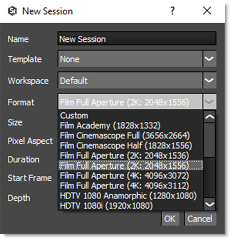 You must create a session before you can start working with your footage. It describes the resolution, bit depth, duration, frame rate and aspect ratio as well as what nodes you will be using. You can create a new session by: