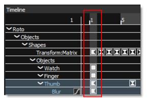Objects can be selected within the Timeline. Clicking the name of an object selects it. Multiple objects can be selected by Shift-clicking on them. Ctrl/Cmd-clicking an object after it is selected will deselect it.