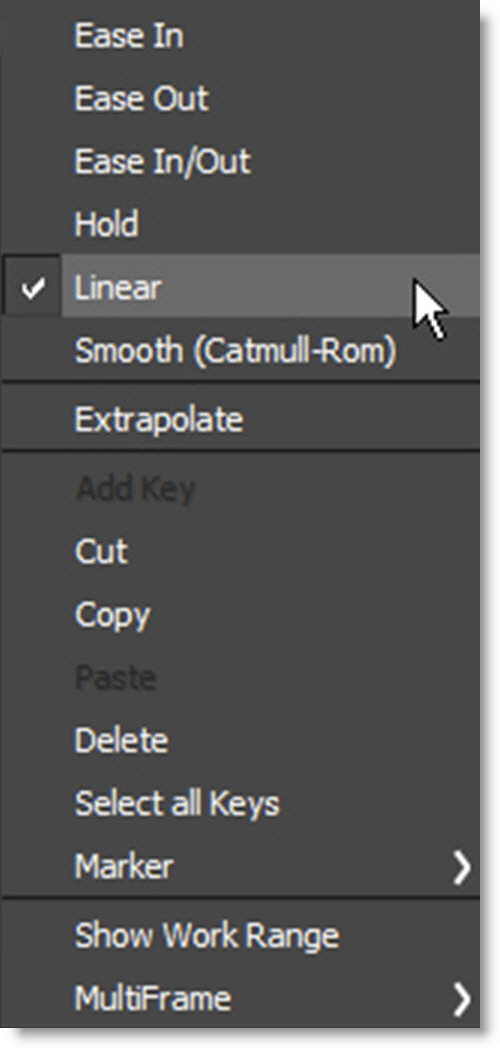 Right-click over a selected keyframe in the Timeline or point in the Curve Editor to open the Timeline pop-up menu.